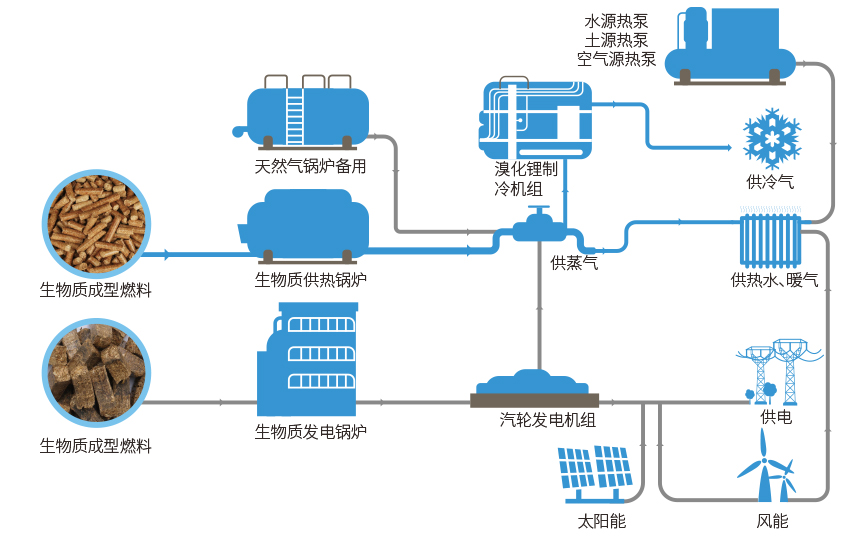 多能源、多聯供分布式清潔能源站,以生物質成型燃料供熱為主導,集合太陽能、風能、生物質能、天然氣等清潔能源利用技術,為工業企業及園區提供蒸汽、熱力、冷氣及電力單供或聯供服務,為區域能源供應提供一站式解決方案。廣泛應用于食品、飲料、印染、紡織、冶金、化工、煙草、軍工、醫院醫藥等行業。